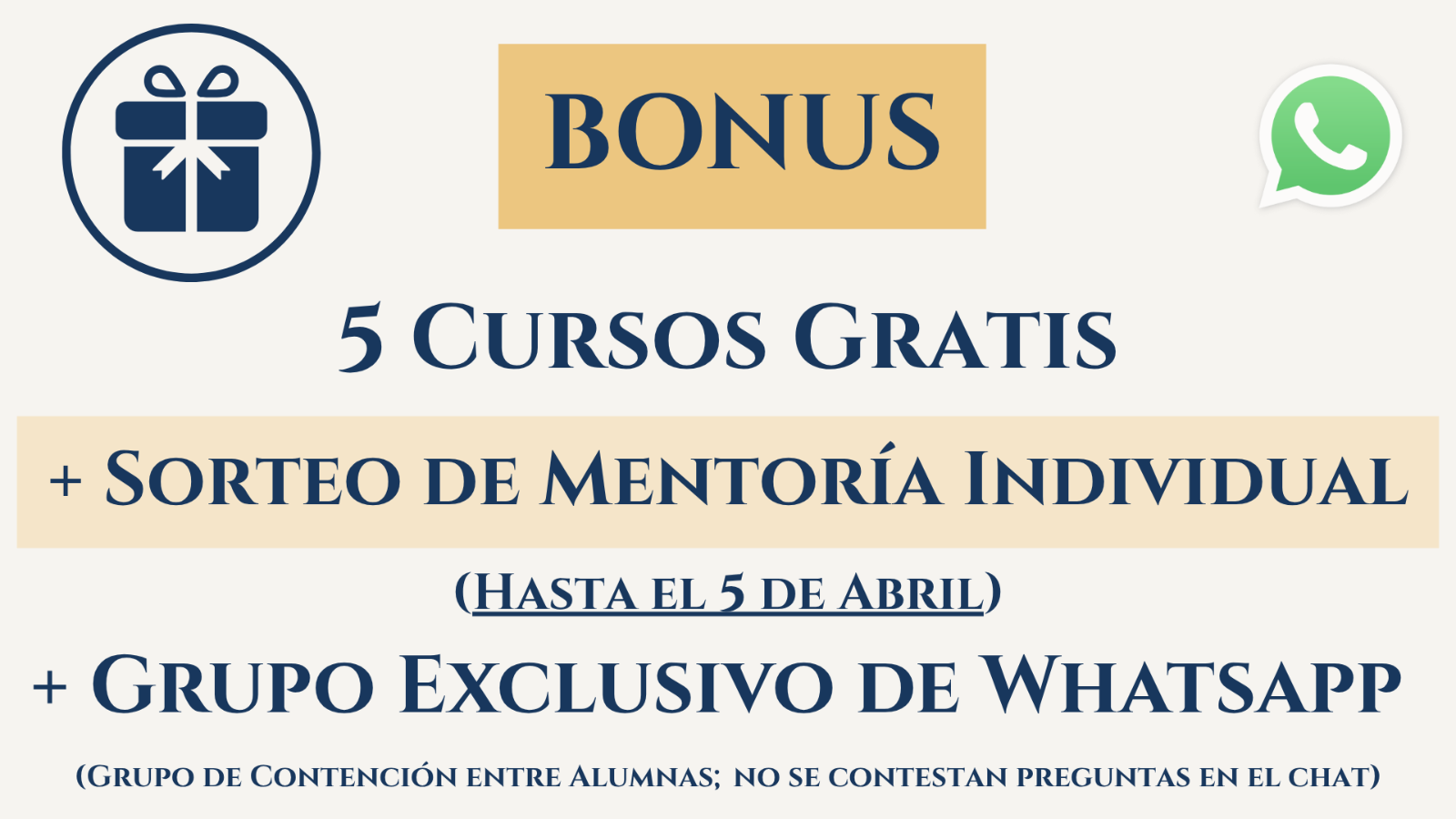 El Grupo Exclusivo de Whatsapp es un canal espectacular de contención entre Alumnas, ya que entre ellas se apoyan, se siguen en redes y se contestan las dudas. Yo no contesto dudas por ahí (sí en las clases en vivo y mentorías individuales y grupales)